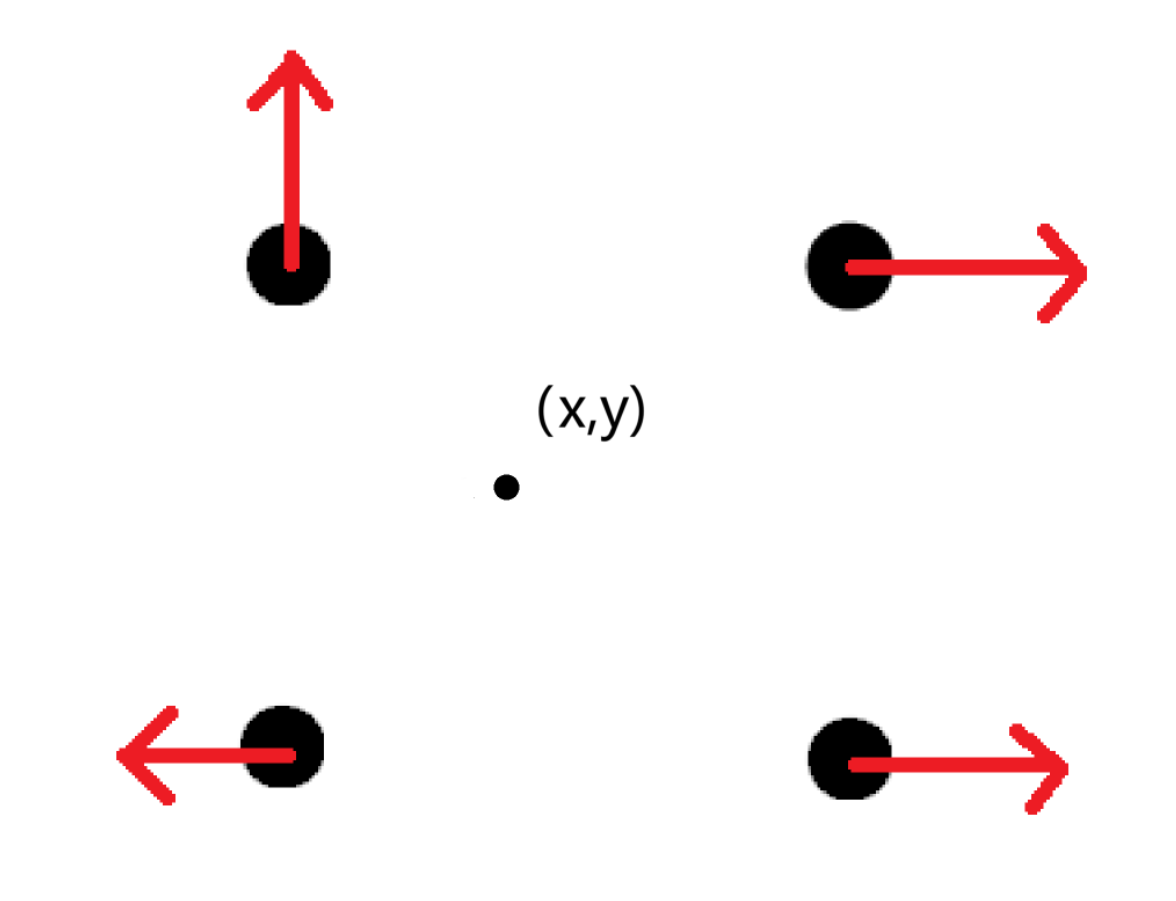 接下来我们计算输入点 $(x, y)$ 与各格点之间的相对向量,并将其与该格点的梯度向量做点积(dot product)。这个点积的结果表示: