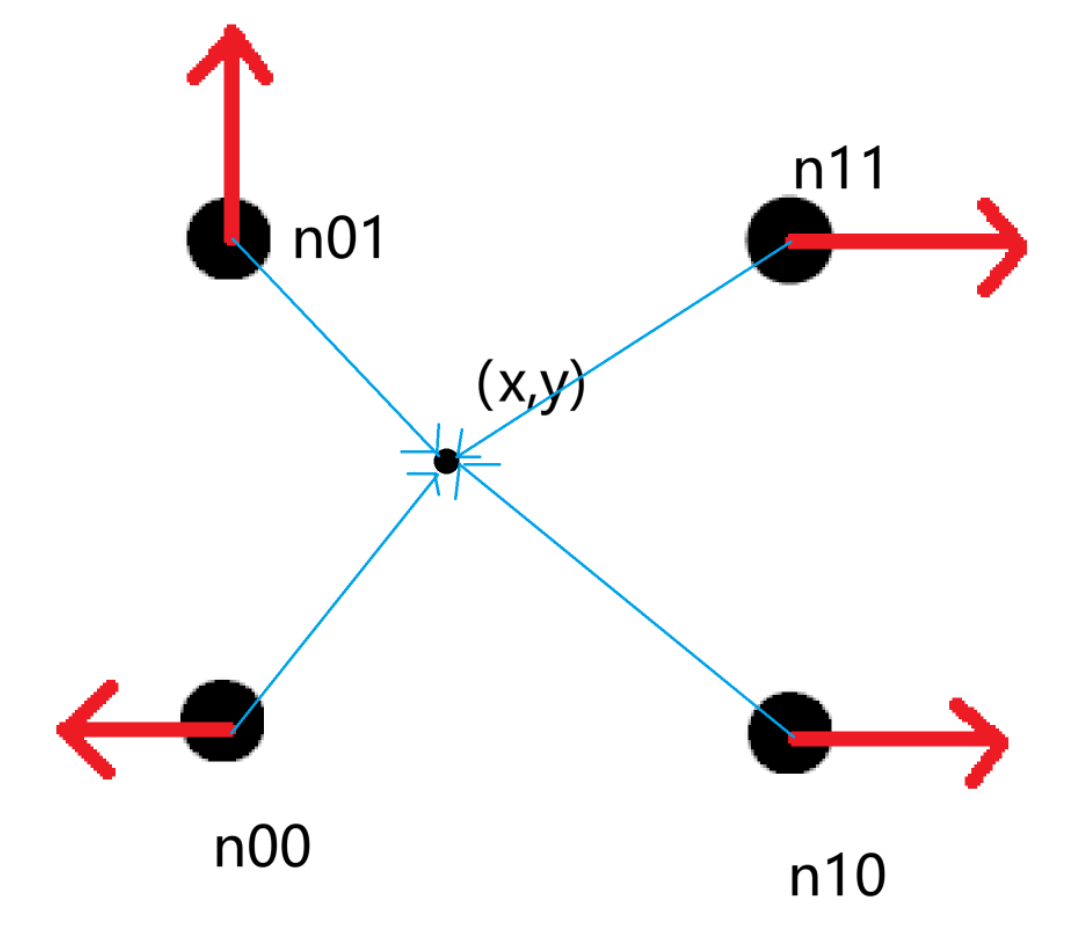 每个格点 $(x_0, y_0)$、$(x_1, y_0)$、$(x_0, y_1)$、$(x_1, y_1)$ 都会被分配一个梯度向量 $g_{00}$、$g_{10}$、$g_{01}$、$g_{11}$,如下图所示:(注:为方便展示,后续图只会展示一个格子)